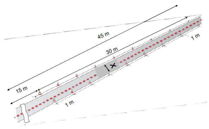 Disporre al termine del corridoio di figura, ed alla distanza di 1 metro, 2 coni in modo che il relativo allineamento risulti perpendicolare con il percorso, e tale che l'asse di questo coincida con l'asse del segmento delimitato dai 2 coni.