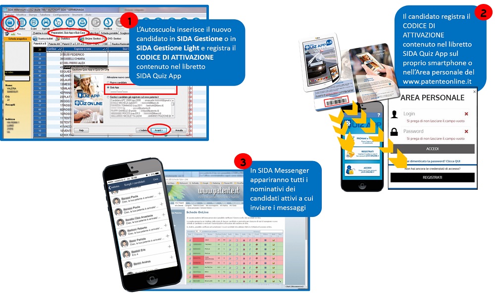 NOTA BENE: SIDA Messenger funziona solo se il candidato ha scaricato sul proprio smartphone una versione aggiornata di SIDA Quiz App e registrato il codice di attivazione contenuto nel libretto fornito dall'Autoscuola. Inoltre l'Autoscuola deve provvedere ad inserire in SIDA Gestione o SIDA Gestione Light il nome del candidato e il codice di attivazione.