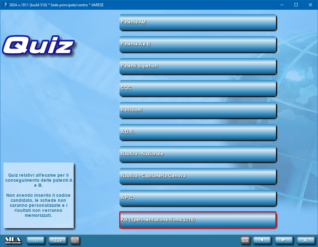 Il modulo quiz di SIDA è stato aggiornato con il nuovo listato per il conseguimento del KB elaborato dalla Motorizzazione di Roma ed esteso, a partire dal 2 gennaio 2019 in tutta Italia.