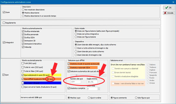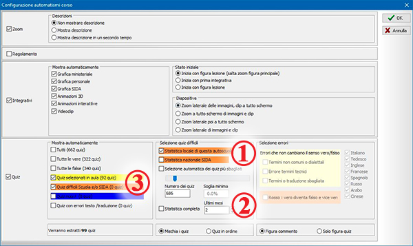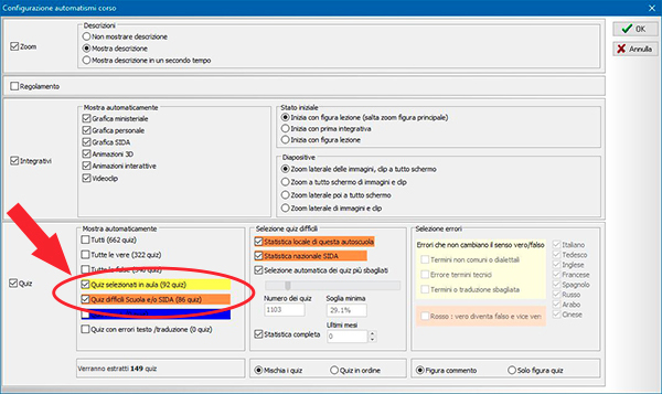 A questo punto si attivano tutte le funzioni che consentono di personalizzare la selezione dei quiz difficili, che verranno proiettati in base alla selezione scelta.