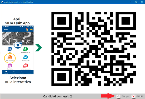 Per evitare che candidati ritardatari disturbino la lezione già iniziata, o per evitare difficoltà di scansione in caso di proiettori molto luminosi, consigliamo di fare una stampa del QR code di SIDA AULA e appenderlo fuori dall'aula, o in aula in una zona non di disturbo per chi già segue la lezione. In questo modo chiunque abbia ritardo o difficoltà nella scansione potrà utilizzare questa stampa per collegarsi.