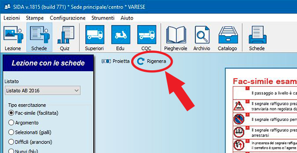 - il tipo di esercitazione (scheda fac-simile esame; per argomento; con quiz selezionati dall'insegnante - gialli -; con quiz difficili - arancioni - o, in caso di entrata in vigore di nuovi quiz, con i quesiti nuovi, identificati in blu).