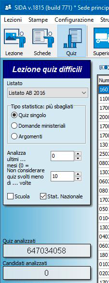Il docente sta lavorando sul listato della patente A e B 2016 (voce Listato nell'immagine) Il docente sta esaminando i singoli quiz, ovvero le singole affermazioni più sbagliate di tutto il listato ministeriale per la patente A e B (voce "Quiz singolo" nell'immagine) Il docente sta lavorando sulla base della statistica nazionale (casella Stat. Nazionale spuntata) Infatti i quiz analizzati per la statistica sono 647.034.058 (voce "quiz analizzati") |
