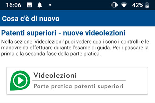 Anche nell'app di SIDA, nella funzione "VideoLezioni" - Video Prova pratica Superiori sono visibili i filmati specifici. Gli allievi che si esercitano con SIDA Quizapp verranno informati da un messaggio dedicato: