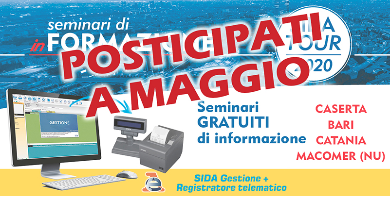 In considerazione della contingente situazione presente in alcuni territori italiani e a seguito delle disposizioni emanate da alcune regioni che invitano a "sospendere iniziative di qualsiasi natura, di eventi e di ogni forma di riunione in luogo pubblico o privato anche se svolti in luoghi chiusi aperti al pubblico", SIDA Autosoft Multimedia ha deciso di posticipare a maggio 2020 le tappe di SIDA Tour previste per Caserta, Bari, Catania e Macomer.