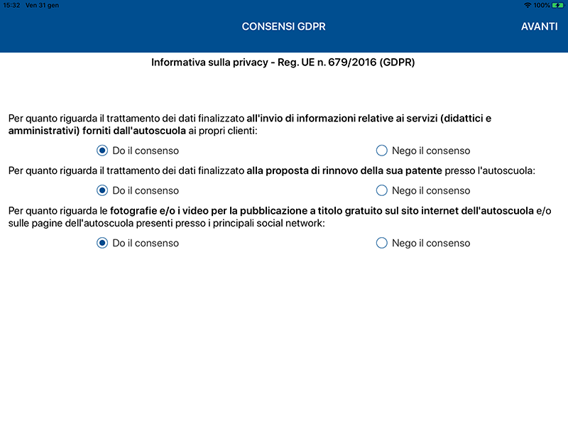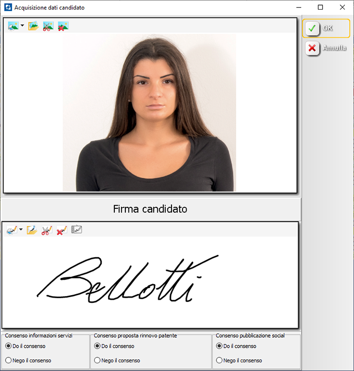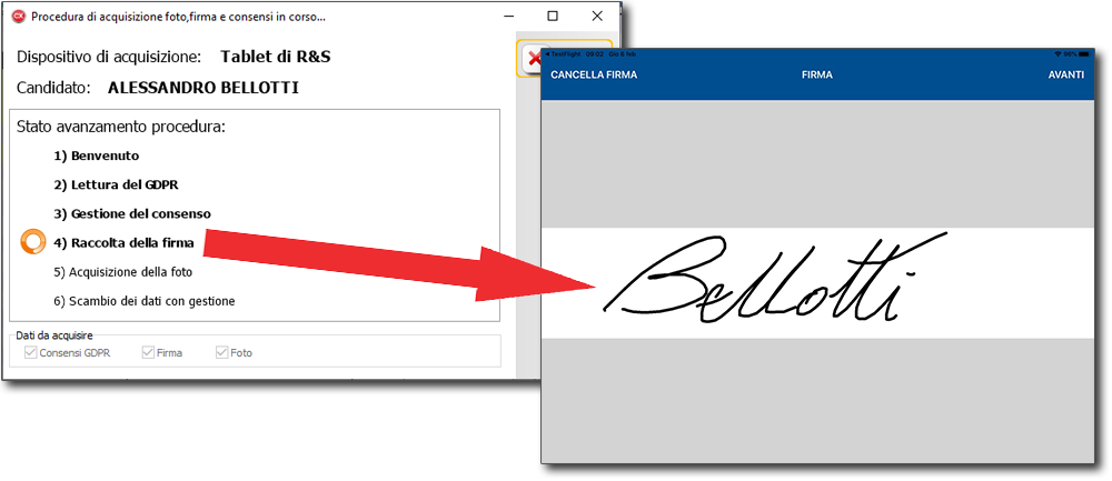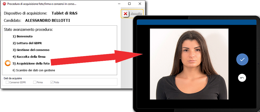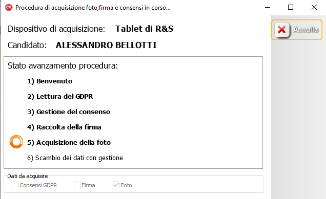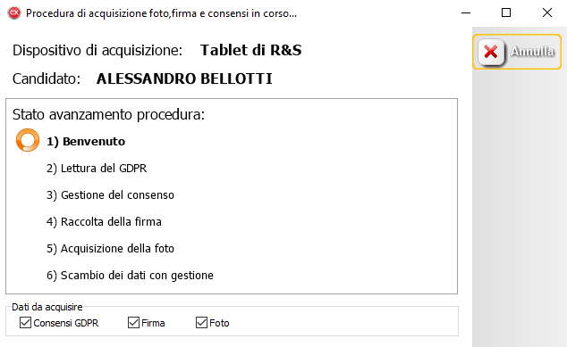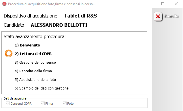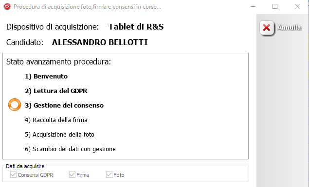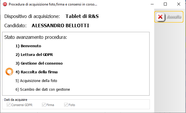 Di seguito mostriamo la procedura di acquisizione del modulo GDPR, della firma e della foto del candidato.