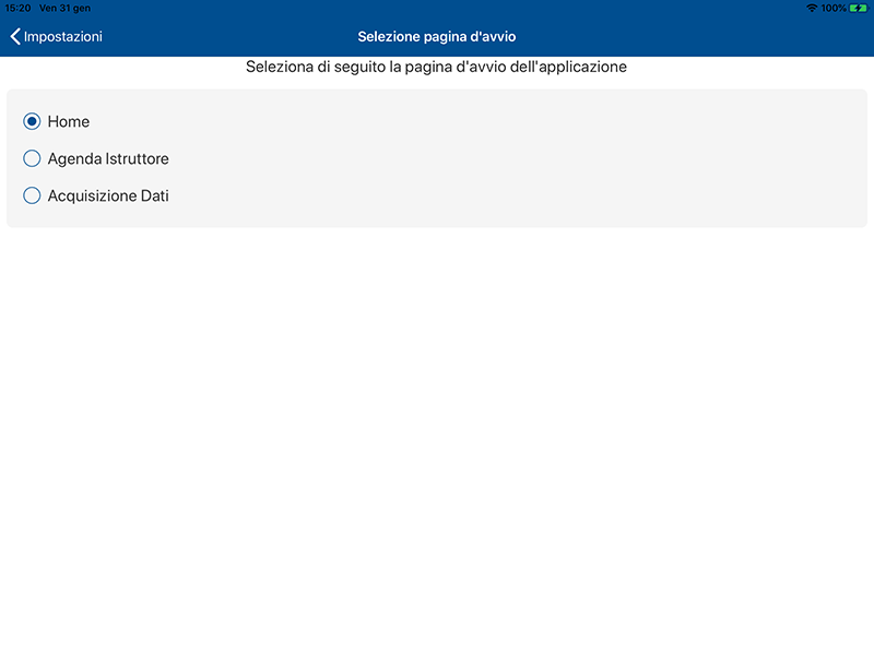 Cliccando sull'icona in alto a sinistra (le tre linee orizzontali bianche) compare il menu laterale da cui è possibile accedere all'agenda guide istruttore, all'acquisizione dei dati dal candidato (foto, firma e GDPR), alle impostazioni dell'applicazione e al logout (disconnessione).
