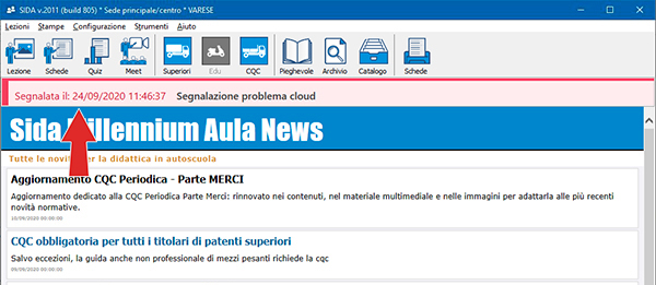 In SIDA Aula, nella schermata principale del software, nella schermata principale del software, è presente un elenco di segnalazioni costantemente aggiornato, che segnala in tempo reale la presenza e/o la soluzione di malfunzionamenti sul Cloud, sul portale o altri servizi web.