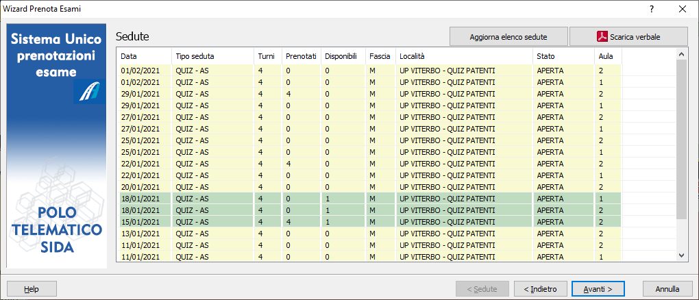 L'elenco sedute è stato migliorato evidenziando le sedute con posti disponibili in verde rispetto a quelle con posti esauriti.