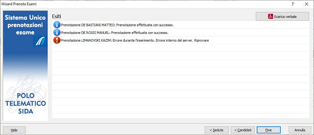 Nel caso in cui una prenotazione non vada a buon fine, è ora possibile scegliere se tornare alle sedute (premento il pulsante "< Sedute") per selezionare un'altra seduta d'esame, oppure tornare all'elenco dei candidati (premento il pulsante in basso "< Candidati")