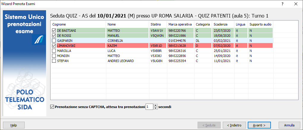 Nel caso in cui, come sopra, si intenda ritentare la prenotazione che non è andata a buon fine per un errore di sistema, tornando all'elenco candidati, vengono evidenziate in rosso le prenotazioni che non sono andate a buon fine, mentre in verde quelle andate a buon fine.