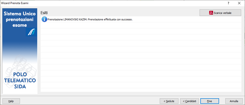 È possible stampare l'elenco dei soli candidati prenotati dall'autoscuola di riferimento (in formato PDF) premendo il pulsante in alto "Scarica verbale".