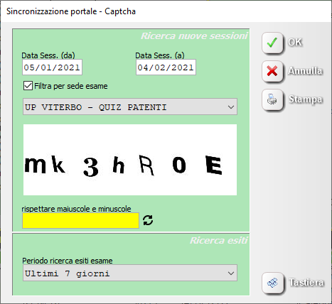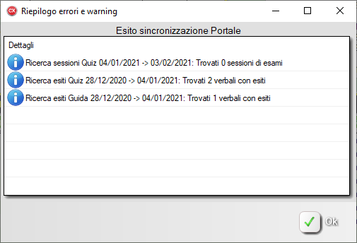 È stata migliorata la messaggistica per quanto riguarda l'esito della sincronizzazione. Vengono riportate nel dettaglio le nuove sessioni quiz trovate per il periodo selezionato, e gli esiti registrati relativi alle ultime sessioni d'esame.