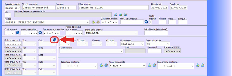 - Data ed esito esami: nell'anagrafica del candidato è possibile registrare automaticamente la data e l'esito dell'esame cliccando semplicemente sull'icona della lente di ingrandimento.