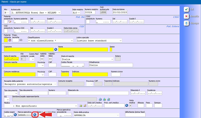 - Dati marca operativa: nell'anagrafica del candidato è possibile recuperare e inserire automaticamente tutti i dati relativi alla marca operativa: basta inserire il numero della marca operativa e successivamente cliccare sull'icona della lente di ingrandimento.