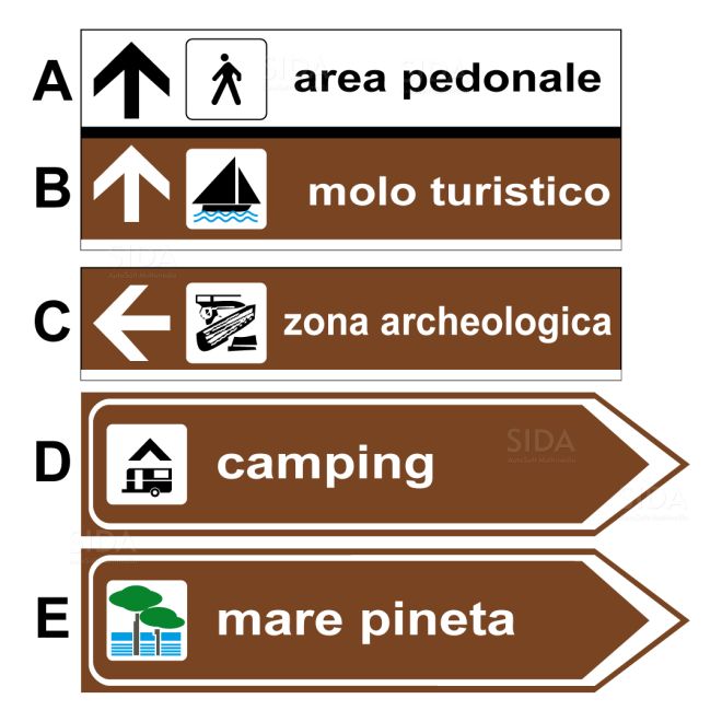 Art. 134. Regolamento di Attuazione Segnali turistici e di territorio 1. Le indicazioni di questa categoria possono essere inserite nei segnali di cui agli articoli 127, 128, 130 e 131 e si suddividono nelle seguenti tipologie espresse in maniera, sintetica, rinviando per il dettaglio all'articolo 78, comma 2: a) turistiche; 2. I segnali con le indicazioni di cui al comma 1 possono essere posti in posizione autonoma e singola, come segnali di direzione isolati, o come segnali di localizzazione, ma in tal caso non devono interferire con l'avvistamento e la visibilità dei segnali di pericolo, di prescrizione e di indicazione di cui al presente regolamento. Se impiegati devono essere installati unicamente sulle strade che conducono direttamente al luogo segnalato, e salvo casi di impossibilità, a non oltre 10 km di distanza dal luogo. 3. L'onere per la fornitura, per l'installazione e la manutenzione dei segnali di cui al comma 1 è a carico del soggetto interessato all'installazione; qualora trattasi di soggetto diverso dall'ente proprietario della strada, dovrà essere ottenuta la preventiva autorizzazione di quest'ultimo, che fisserà i criteri tecnici per l'installazione. 4. I segnali di indicazione turistica e territoriale sono a fondo marrone con cornici ed iscrizioni di colore bianco. Simboli, iscrizioni e composizione grafica sono esemplificati dalle figure II.294 e II.295. L'inizio del territorio comunale o di località entro il territorio comunale di particolare interesse può essere indicato con segnali rettangolari a fondo marrone di dimensioni ridotte. 5. I segnali con le indicazioni di cui al comma 1, lettera b) possono essere installati, a giudizio dell'ente proprietario della strada, qualora per la configurazione dei luoghi e della rete stradale si reputi utile l'impianto di un sistema segnaletico informativo di avvio alle zone di attività, purchè non compromettano la sicurezza della circolazione e la efficacia della restante segnaletica e siano installati in posizione autonoma. Ove non esista una zona di attività concentrate, l'uso di segnali di avvio ad una singola azienda è consentito sulle strade extraurbane se l'azienda stessa è destinazione od origine di un consistente traffico veicolare, sempre nel rispetto delle prescrizioni di cui ai commi 2 e 3. 6. Nessuna indicazione di attività singola può essere inserita sui preavvisi di intersezione, sui segnali di pres segnali di direzione, su quelli di conferma Può essere invece installato nelle intersezioni e combinato, ove necessario col "gruppo segnaletico unitario" ivi esistente, il segnale di direzione con l'indicazione di "zona industriale, zona artigianale, zona commerciale" (fig. II.296) che, col relativo simbolo, può essere inserito nei preavvisi di intersezione o nei segnali di preselezione. 7. Nei centri abitati, ove la zona o le zone industriali, artigianali o commerciali sono ben localizzate, si deve fare uso di segnali indicanti collettivamente la zona; tutte le attività e gli insediamenti particolari saranno indicati successivamente sulle intersezioni locali a valle degli itinerari principali di avvio alla "zona industriale" o "zona artigianale" o "zona commerciale" in genere (fig. II.297). 8. Le parole ed i simboli indicanti il logotipo delle ditte possono essere riprodotti con la grafica propria, al fine di renderne visivamente più agevole la percezione. 9. I segnali di indicazione alberghiera devono far parte di un sistema unitario ed autonomo di segnalamento di indicazione qualora, a giudizio dell'ente proprietario della strada, sia utile segnalare l'avvio ai vari alberghi. L'installazione di tale sistema segnaletico è subordinata alla autorizzazione dell'ente proprietario della strada che stabilirà le modalità per la posa in opera. 10. La segnaletica di indicazione alberghiera comprende: a) un segnale con funzione di preavviso di un punto o di un ufficio di informazioni turistico-alberghiere o del segnale di informazione di cui alla lettera b) seguente (fig. II.298); 11. I segnali di indicazione alberghiera sono a fondo bianco con cornici, simboli, iscrizioni e composizione grafica come esemplificati dalle figure. |